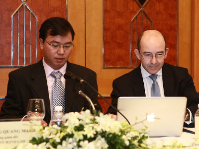 Ông Đặng Quang Mạnh và đại diện Công ty FIT (Pháp) - đơn vị đặt hàng và xuất khẩu sữa Danlait cho Mạnh Cầm tại buổi họp báo tháng 4/2013