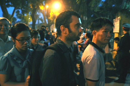 18h, đã hết giờ viếng Đại tướng ngày đầu tiên, song hàng nghìn người, gồm cả già trẻ, người nước ngoài vẫn lặng lẽ xếp hàng mong được vào bên trong. Ảnh: Quý Đoàn.
