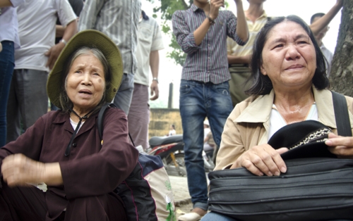 Bà Nguyễn Thị Cúc và Trần Thị Quỳnh Mai vẫn ngồi khóc ở bên đường, đối diện cổng nhà Đại tướng sau khi vào viếng. Ảnh: Nguyên Anh.