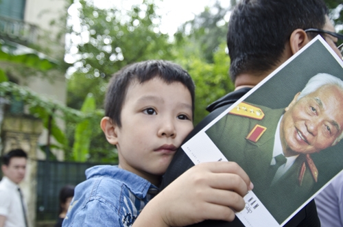 Cậu bé ngồi trên lưng bố chờ được vào viếng, mặt buồn bã với tấm ảnh Đại tướng trên tay. Ảnh: Nguyên Anh