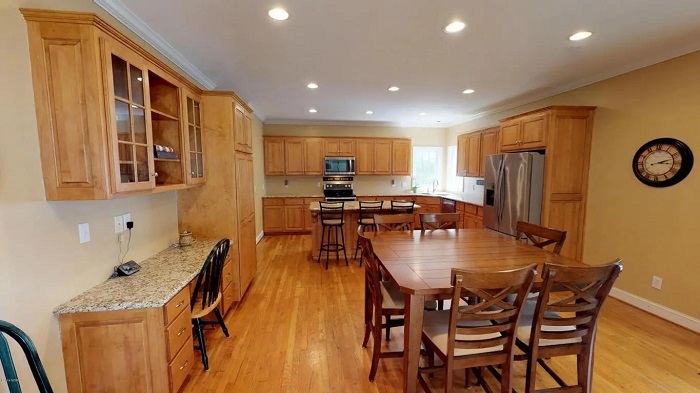 Nhà bếp được trang bị đầy đủ nội thất với mặt bàn lót bằng đá granit, có quầy bar để ăn sáng và tủ đựng thức ăn. Phòng sinh hoạt gia đình được gắn sẵn lò sưởi đốt củi.