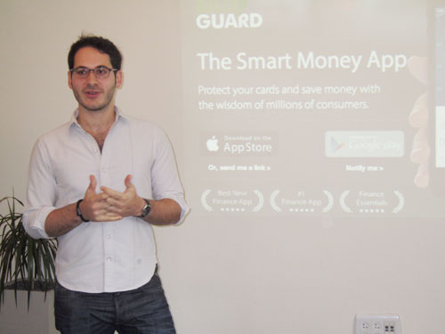 Nhà sáng lập trẻ của Công ty khởi nghiệp BillGuard, Raphael Ouzan đang giới thiệu phầm mềm ứng dụng trên mobile của công ty - Ảnh: K.H