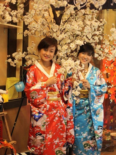 Hiền (bên trái) mặc trang phục kimono Nhật Bản tại nhà hàng sushi.