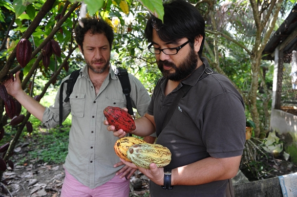 Vincent Mourou (trái) và Sam Maruta (phải) đang xem xét các quả cacao - Ảnh: Japan Times