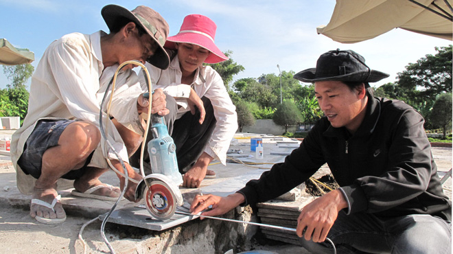 Văn Nghĩa (bìa phải) cùng công nhân tại công trình nâng cấp nghĩa trang liệt sĩ huyện Cao Lãnh - Ảnh: T.Tú