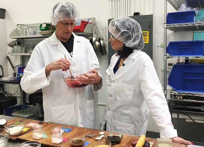 Tiến sĩ Patrick Brown mất 3 năm nghiên cứu mới tìm ra công thức làm bánh kẹp nhân thực vật có hương vị giống như thịt. Ảnh: CNN.