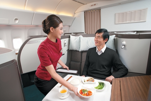 Tất cả các món ăn trên Cathay đều được làm theo thực đơn hành khách lựa chọn, gồm cả món châu Á và quốc tế. Để giải trí, hành khách có thể chọn trong hơn 100 bộ phim, 500 TV show và 22 kênh radio bằng 10 ngôn ngữ trên màn hình cá nhân. Điều đặc biệt là khoang hạng nhất của họ chỉ có 6 - 9 ghế ngồi.