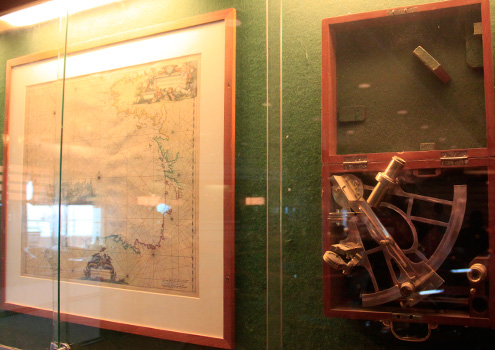 Phía trong một quầy bar được trang trí các dụng cụ hàng hải để giới thiệu đến du khách quá trình xây dựng du thuyền.