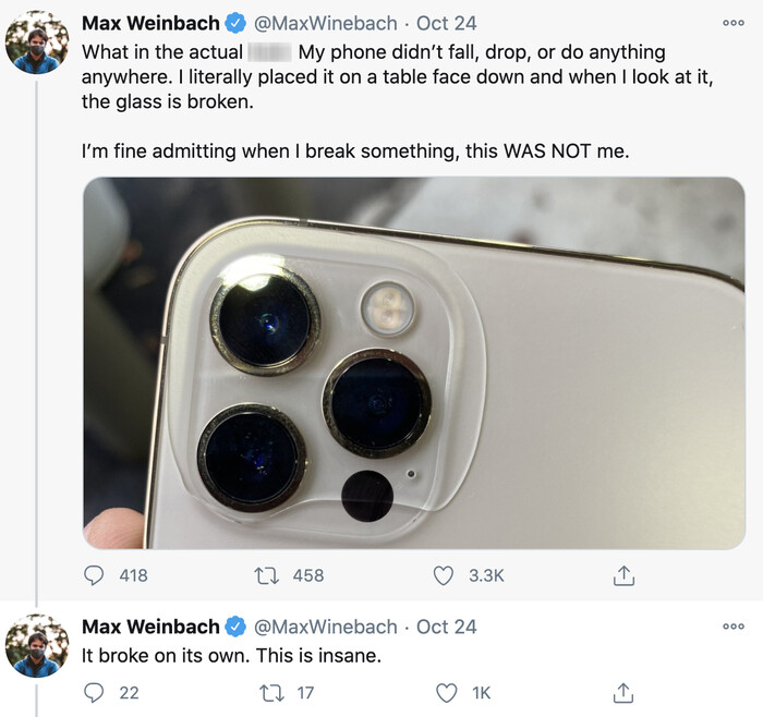 Chuyên gia rò rỉ Max Weinbach cho biết, chiếc điện thoại iPhone 12 Pro của anh bị nứt mặt sau khó hiểu dù không bị va chạm hay rơi rớt. Leaker này khẳng định, bản thân không hề khiến mặt lưng chiếc iPhone 12 Pro bị vỡ. (Ảnh: @MaxWeinbach)
