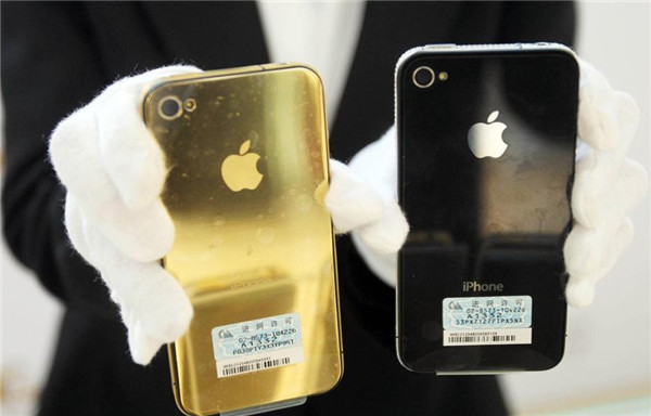 Vàng và bạch kim được dát lên chiếc iphone 4 tại Thanh Đảo, Sơn Đông vào ngày 25/3/2011.