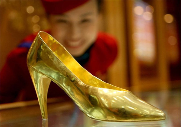 Một đôi giày cao gót dát vàng trưng bày tại thành phố An Huy vào ngày 14/3/2009.