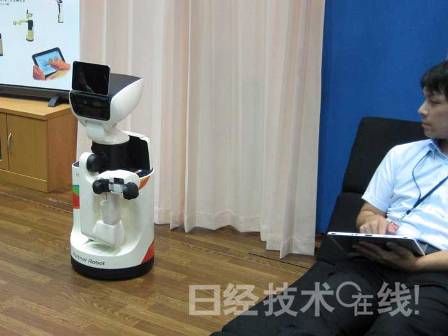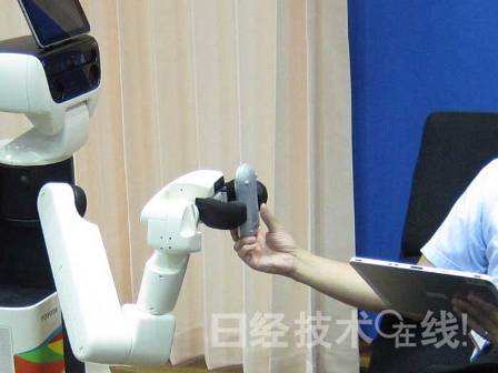 Hơn nữa, khi nhặt vật bị rơi, bởi vì vị trí vật bị rơi chưa được lập trình sẵn, do đó không dùng chỉ lệnh ngôn ngữ mà dùng máy tính bảng nhập lệnh vào. Ví dụ, khi nhặt lên cái điều khiển từ xa, thông qua màn hình thao tác máy tính bảng, di chuyển robot tới sao cho chiếc điều khiển nằm trong tầm quan sát của HSR. Camera lập thể đồ họa sẽ hiển thị trên máy tính bảng. Sau đó, thông qua màn hình cảm ứng trên máy tính bảng, nhấn chọn chiếc điều khiển là đối tượng lựa chọn, rồi ấn nút “nhặt lên”, HSR sẽ bắt đầu thực hiện động tác nhặt chiếc điều khiển lên (hình 5).