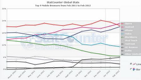 Theo StatCounter, ltrước đó, Opera đã giữ “ngôi vua” trong suốt năm 2011, nhưng tới giai đoạn hai tháng đầu năm 2012, trình duyệt này bị mất thị phần rất nhanh chóng, trong khi iPhone Safari và Android Robot có đà thăng tiến mạnh mẽ.