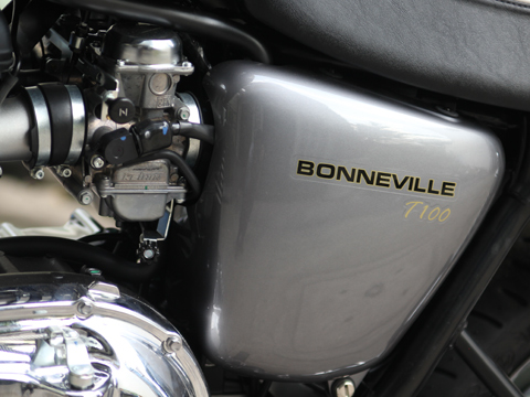 Phần đầu xe mang đậm dấu ấn cổ điển với cụm đèn pha tròn kết hợp đồng hồ hiển thị với hai hình khối tròn. Bonneville T100 với bánh nan hoa 17 inch và với nước sơn hai màu. T100 sử dụng động cơ hiện đại nhưng thiết kế theo kiểu dáng hai xi-lanh song song truyền thống, làm mát bằng không khí, dung tích 865 phân khối, công suất cực đại 67 mã lực tại vòng tua máy 7.500 vòng/phút, mô-men xoắn 68 Nm tại 5.800 vòng/phút. Tổng trọng lượng 225 kg.