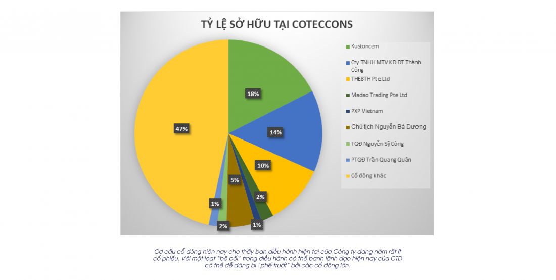Trở lại câu chuyện của Coteccons, sau khi tờ trình sáp nhập Riccons vào Coteccons bị bác bỏ vào năm 2019, mâu thuẫn giữa ban lãnh đạo hiện nay và cổ đông ngày càng sâu sắc. Đặc biệt, vào đầu tháng 6 vừa qua Ban kiểm soát của Công ty mà Trưởng ban kiểm soát là đại diện cho các cổ đông lớn đã gửi công văn lên UBCK chỉ ra nhiều sai phạm của ban điều hành hiện nay. Điều này, cũng đã ảnh hưởng nghiêm trọng tời hoạt động doanh nghiệp.