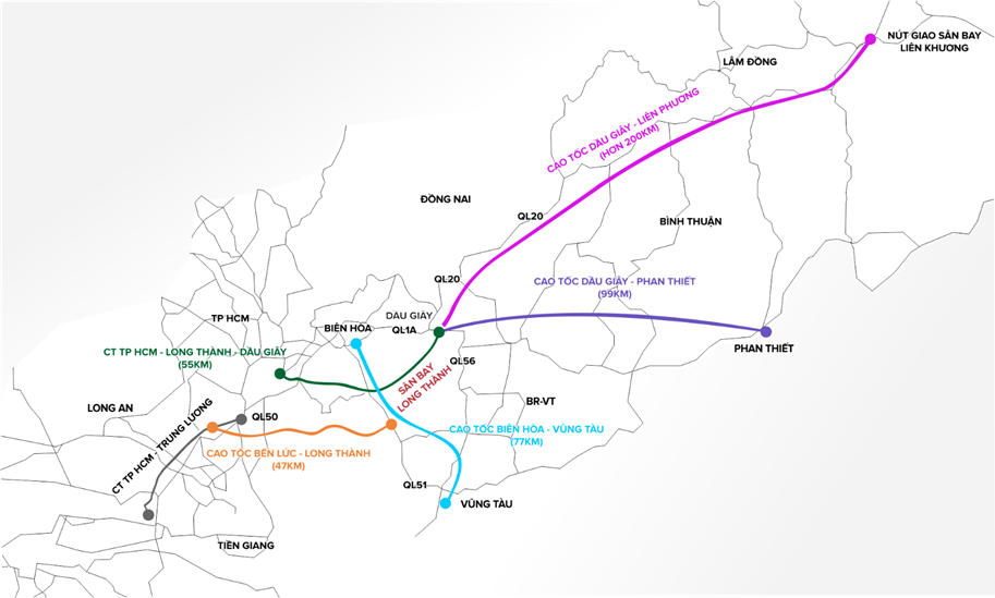 Bên cạnh sân bay, hệ thống đường cao tốc đóng vai trò quan trọng trong việc kết nối Đồng Nai với các tỉnh lân cận, tạo nên những cú hích lớn cho bất động sản. Cao tốc Biên Hòa - Vũng Tàu, TP.HCM - Long Thành - Dầu Giây cùng các tuyến đường Vành đai 3 và 4 đã và đang góp phần mở rộng mạng lưới giao thông khu vực Đông Nam Bộ. Đặc biệt, tuyến cao tốc Biên Hòa - Vũng Tàu, dự kiến hoàn thành vào năm 2025 sẽ rút ngắn thời gian di chuyển từ Đồng Nai đến Bà Rịa - Vũng Tàu xuống dưới một giờ, từ đó thúc đẩy phát triển logistics và bất động sản nghỉ dưỡng tại khu vực này.