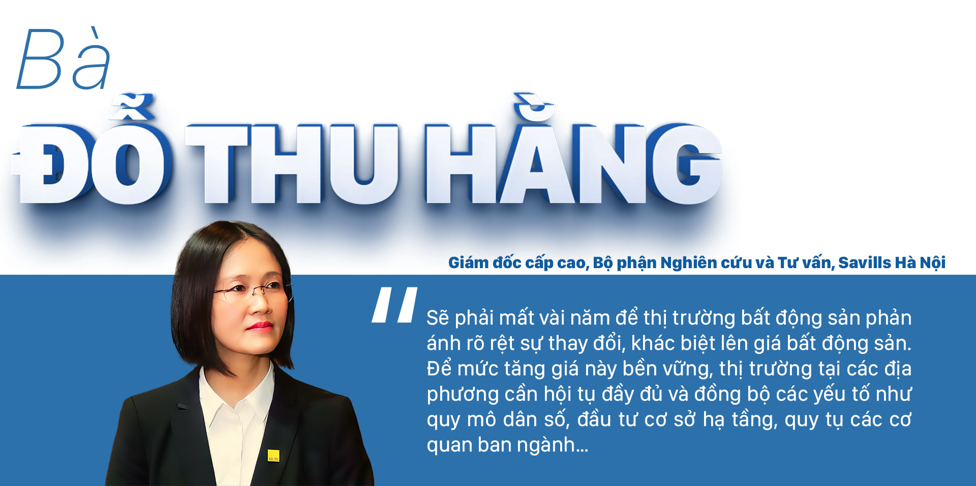 Bà Đỗ Thu Hằng, Giám đốc cấp cao, Bộ phận Nghiên cứu và Tư vấn, Savills Hà Nội nhấn mạnh, lộ trình các huyện lên quân sẽ diễn ra từ nay đến 2025. Sẽ phải mất vài năm để thị trường bất động sản phản ánh rõ rệt sự thay đổi, khác biệt lên giá bất động sản. Để mức tăng giá này bền vững, thị trường tại các địa phương cần hội tụ đầy đủ và đồng bộ các yếu tố như quy mô dân số, đầu tư cơ sở hạ tầng, quy tụ các cơ quan ban ngành…