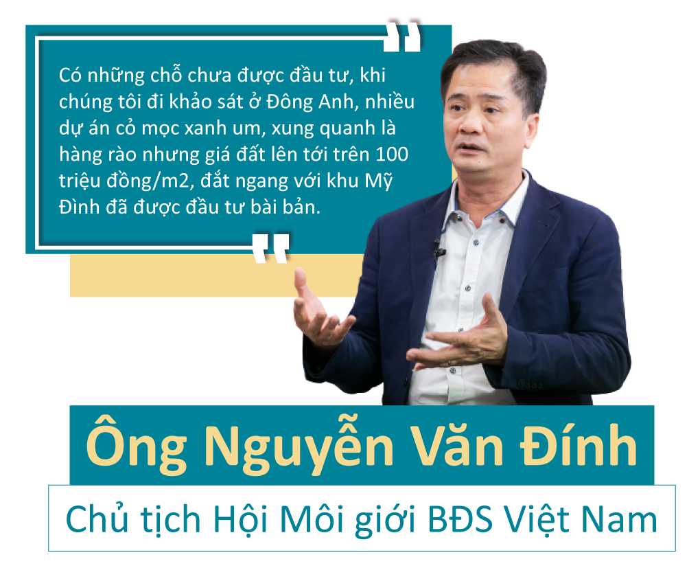 “Có những chỗ chưa được đầu tư, khi chúng tôi đi khảo sát ở Đông Anh, nhiều dự án cỏ mọc xanh um, xung quanh là hàng rào nhưng giá đất lên tới trên 100 triệu đồng/m2, đắt ngang với khu Mỹ Đình đã được đầu tư bài bản”, ông Đính cho biết.