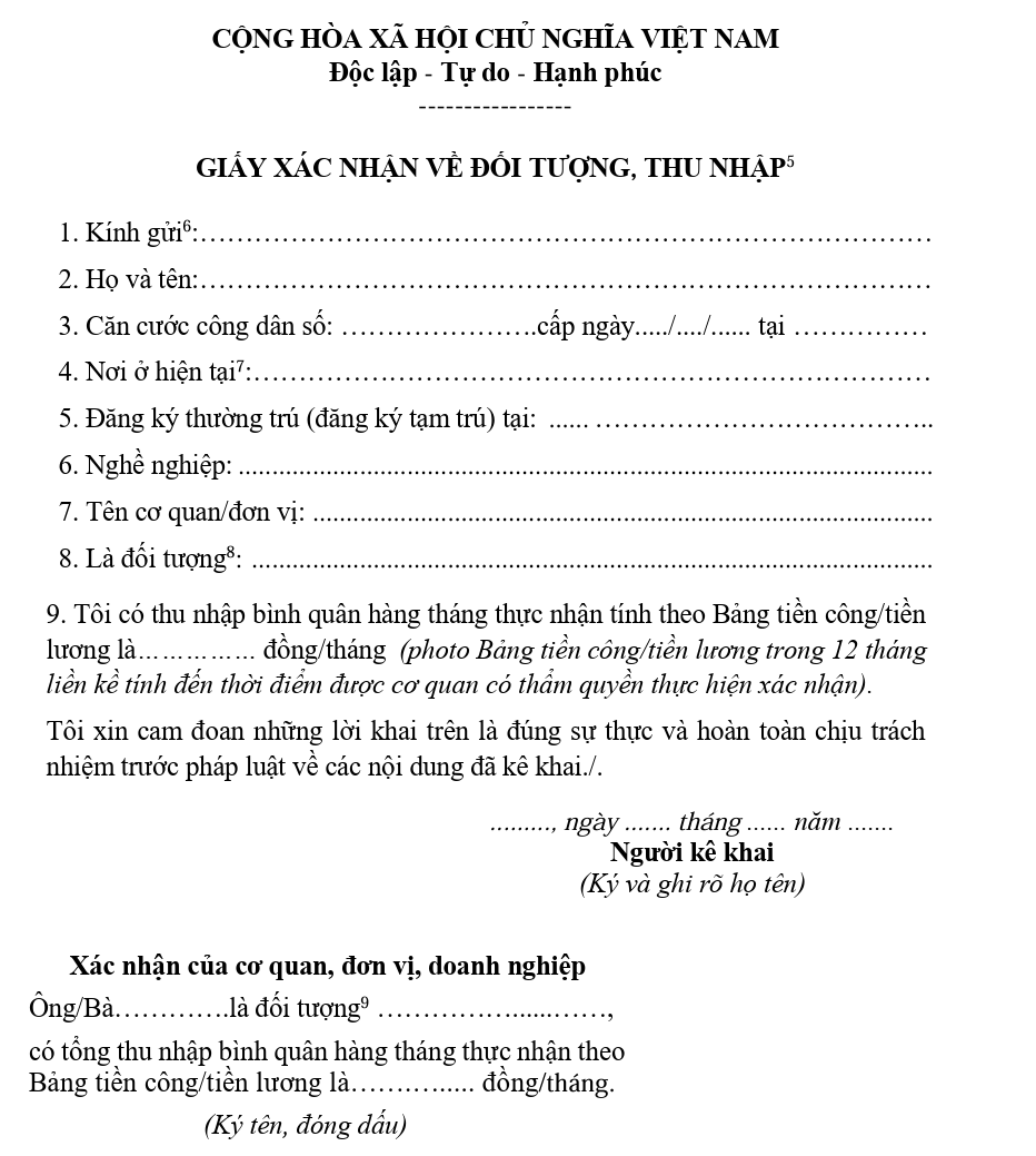 Hướng dẫn cách ghi: (5)Trường hợp các đối tượng này thuê nhà ở xã hội hoặc tự xây dựng hoặc cải tạo, sửa chữa nhà ở thì không phải xác nhận điều kiện về thu nhập tại mục 9 Mẫu này.