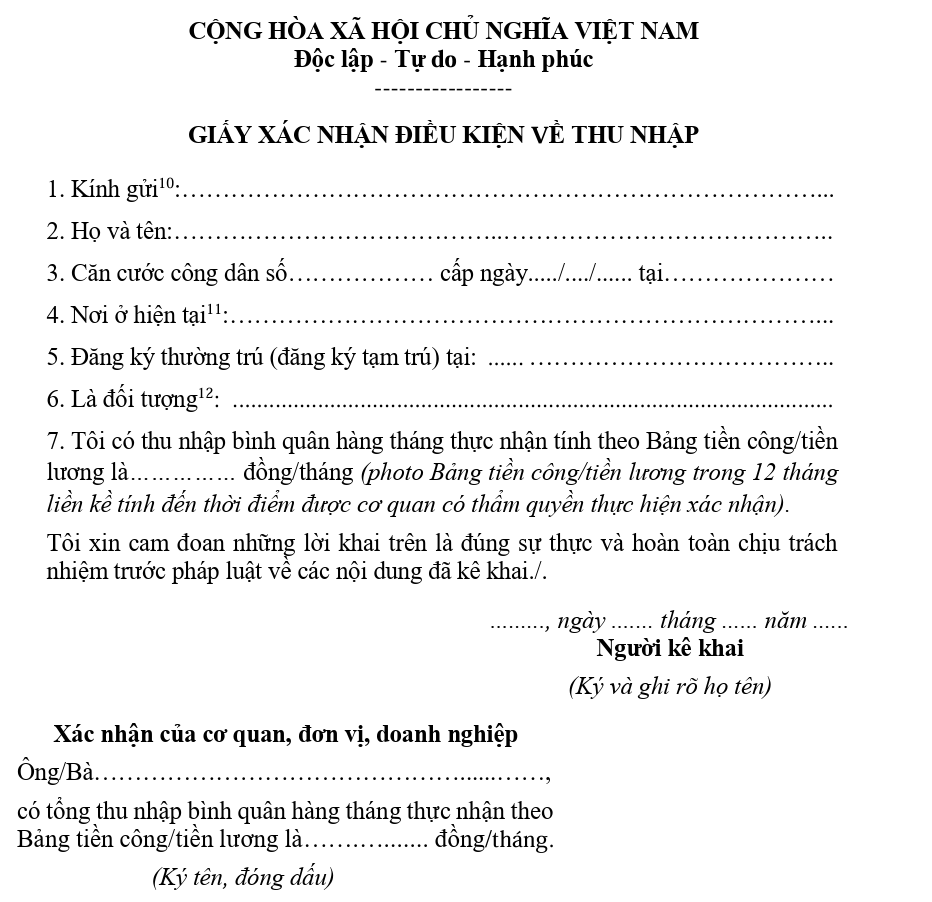 Mẫu số 04. Giấy tờ chứng minh điều kiện về thu nhập để được mua, thuê mua nhà ở xã hội