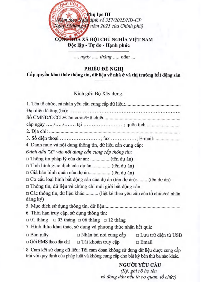 Tổ chức, cá nhân có nhu cầu khai thác thông tin, dữ liệu mang tính chất chuyên ngành, chi tiết về nhà ở và thị trường bất động sản quy định tại Phụ lục VI đính kèm theo Nghị định này gửi phiếu yêu cầu cho Bộ Xây dựng theo các hình thức sau: