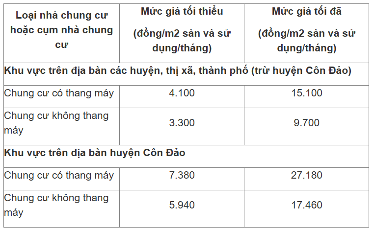 Cụ thể, khung giá dịch vụ quản lý vận hành nhà chung cư (đã bao gồm Thuế giá trị gia tăng 10%) tại Bà Rịa – Vũng Tàu từ 09/12/2024 được quy định như sau: