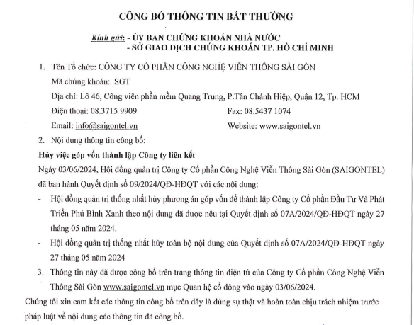 HĐQT CTCP Công nghệ Viễn thông Sài Gòn - Saigontel (SGT) mới đây đã ban hành quyết định thống nhất hủy phương án góp vốn để thành lập CTCP Đầu tư và Phát triển Phú Bình Xanh.