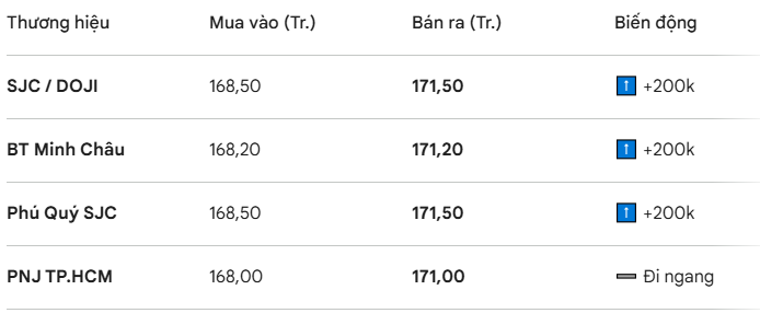 - Phú Quý SJC: Niêm yết tại mốc 168,50 - 171,50 triệu đồng/lượng.