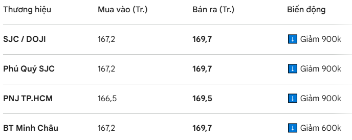 - SJC & DOJI: Giảm mạnh 900.000 đồng/lượng, giá bán ra chỉ còn 169,7 triệu đồng/lượng.
