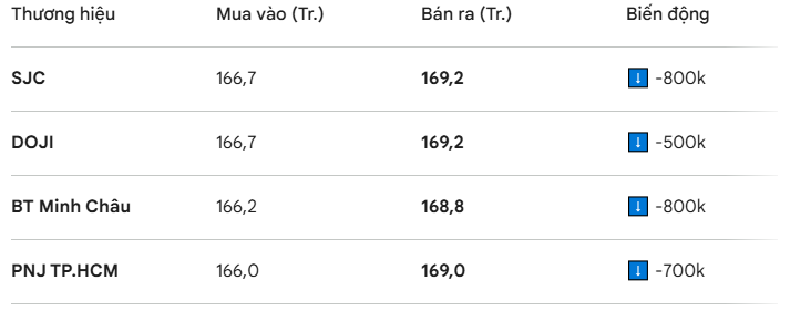 - SJC & DOJI: Giảm mạnh 800.000 đồng (SJC) và 500.000 đồng (Doji), hiện niêm yết quanh mốc 166,7 - 169,2 triệu đồng/lượng.