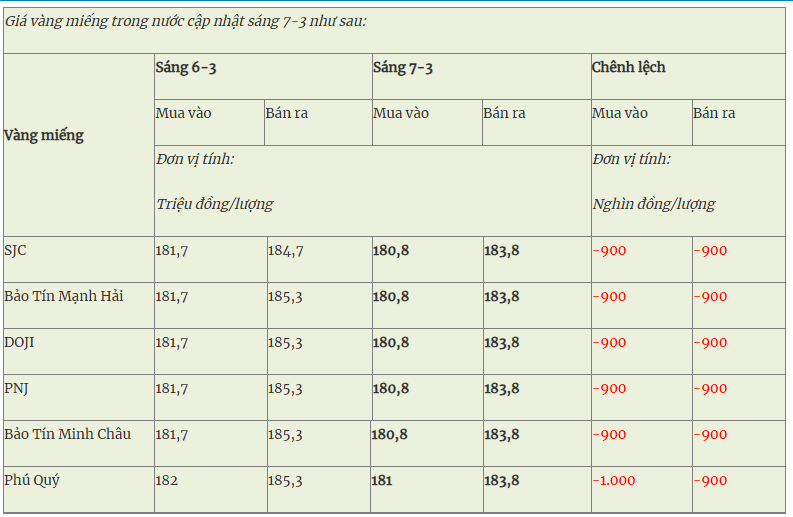 - SJC, Bảo Tín Mạnh Hải, Bảo Tín Minh Châu, PNJ cùng giảm giá vàng miếng 900.000 đồng so với hôm qua, giao dịch vàng miếng ở mức 180,8 – 183,8 triệu đồng/lượng (mua vào – bán ra).