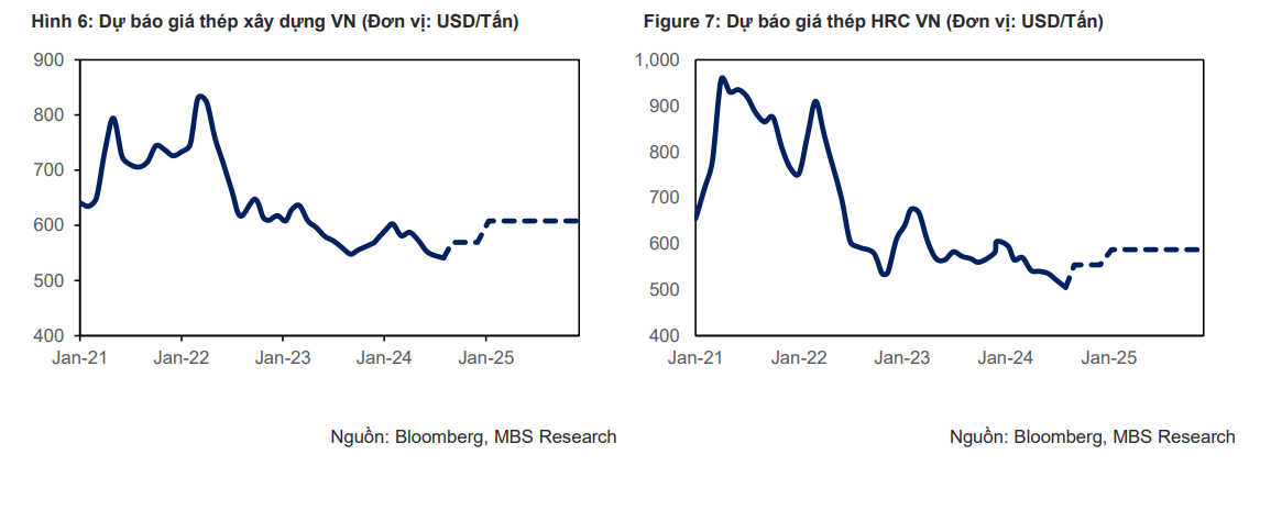 MBS dự báo giá thép xây dựng và HRC Việt Nam sẽ có mức hồi phục tích cực kể từ quý 4/2024 khi áp lực từ Trung Quốc được giảm bớt. Do đó, theo ước tính giá thép xây dựng có thể đạt trung bình 571 USD/tấn, tăng 4% so với năm 2023.