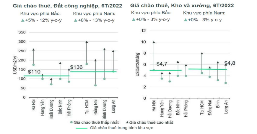 Bất chấp tình hình COVID-19 phức tạp, phân khúc bất động sản công nghiệp vẫn tăng trưởng mạnh mẽ trong nửa đầu năm 2022 với giá cho thuê tiếp tục đà tăng trên toàn quốc và tỷ lệ lấp đầy duy trì ở mức ổn định nhờ nhu cầu thuê rất lớn từ ngành ô tô, hậu cần và điện tử cũng như chính sách không COVID của Trung Quốc đã thúc đẩy xu hướng Trung Quốc+1. Gián đoạn chuỗi cung ứng làm tăng nhu cầu và thúc đẩy nguồn cung mới đối với các trung tâm logistics gần cảng biển, cảng nội địa và sân bay.