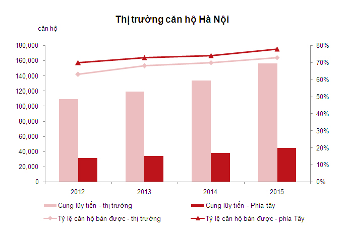 Tính đến quý 3 năm 2015, chỉ ba quận Cầu Giấy, Bắc Từ Liêm, Nam Từ Liêm và huyện Hoài Đức đã cung cấp hơn 44.000 căn hộ ở tất cả các phân khúc trên cả thị trường sơ cấp và thứ cấp, tăng 23% so với cùng kỳ năm trước và chiếm gần 30% tổng số căn hộ của cả thành phố. Trong số đó, hơn 35.000 căn đã có chủ, tỷ lệ hấp thụ đạt gần 80%. Nếu tính riêng trong quý 3 năm 2015, thì tốc độ bán hàng ghi nhận tại các dự án thuộc khu vực phía Tây đạt tỷ lệ 80-90% tại thời điểm mở bán chính thức.