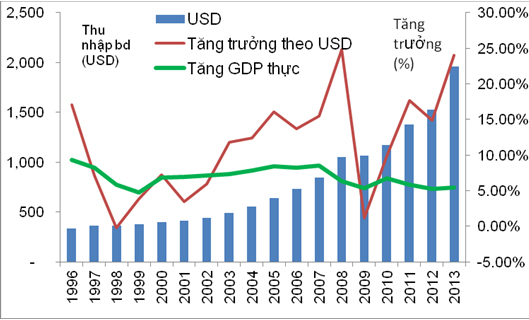 Vào đầu tháng 12 vừa qua, tại Diễn đàn đối tác phát triển Việt Nam (VDPF), Thủ tướng cho biết thu nhập bình quân đầu người năm 2013 của người dân Việt Nam khoảng 1.960 USD. Lập tức thông tin này đã gây xôn xao trong dư luận vì so với con số công bố chính thức của năm trước thì thu nhập bình quân đầu người Việt Nam tăng 23%. Đây là một mức quá cao đối nghịch với những khó khăn trong của nền kinh tế suốt thời gian qua.