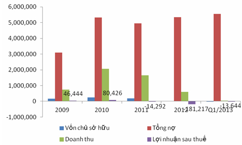 Cụ thể, năm 2010 thời “hoàng kim” của STL thì với số vốn chủ sở hữu vỏn vẹn chỉ có 246 tỷ đồng, nhưng số nợ phải trả của công ty lên đến 5.327 tỷ đồng, tức là đòn bẩy tài chính (tổng nợ/vốn chủ sở hữu) lên đến 21,66 lần. Đây là một con số cao khủng khiếp mà ít doanh nghiệp nào chịu nỗi sự rủi ro. Tuy nhiên, con số này vẫn chưa thấm tháp vào đâu vì với 2 năm thua lỗ liên tiếp 2011, 2012, cuối năm 2012 vốn chủ sở hữu của STL chỉ còn có hơn 5 tỷ đồng, tương đương đòn bẩy tài chính là 110 lần. Không dừng lại ở đó, công ty này tiếp tục thua lỗ trong quý 1/2013 khiến vốn chủ sở hữu âm 8,59 tỷ đồng.