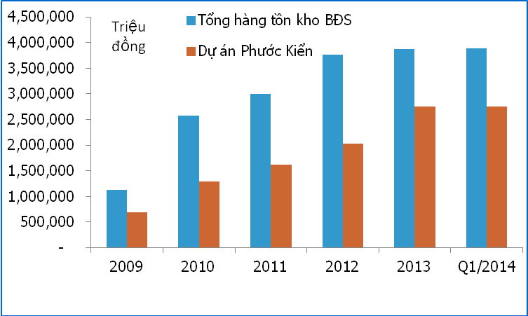 Trong khi đó hàng tồn kho của Công ty vẫn chất cao như núi. Tính đến 31/03/2014, hàng tồn kho của toàn công ty trong báo cáo hợp nhất lên tới 4.049 tỷ đồng, gấp gần 2 lần vốn chủ sở hữu và chiếm 62% tổng tài sản. Trong đó hàng tồn kho của bất động sản là 3.881 tỷ đồng. Số hàng tồn kho tập trung ở một số dự án chung cư như QCGLII, Giai Việt, Hiệp Phú, Trung Nghĩa, The Mansion. Đặc biệt, tồn kho lớn nhất là dự án Khu dân cư Phước Kiển với số tiền lên tới 2.751 tỷ đồng, chiếm 71% tổng số hàng tồn kho bất động sản.