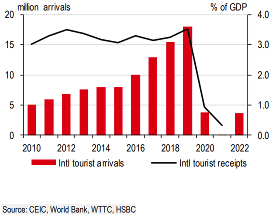 Tuy nhiên, du lịch quốc tế mới chỉ phục hồi phần nào chứ chưa hẳn là hoàn toàn, với lượng khách du lịch đạt 3,6 triệu lượt, chỉ bằng 20% so với mức của năm 2019. Điều đó càng nhấn mạnh tiềm năng đáng kể để mảng dịch vụ tiếp tục phát triển trong bối cảnh nhu cầu thương mại hàng hóa toàn cầu chậm lại, theo HSBC.