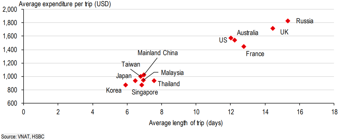 Ví dụ, trước đây, trung bình khách du lịch Trung Quốc đã chi tiêu nhiều hơn và ở lại lâu hơn so với hầu hết khách du lịch châu Á, mặc dù thấp hơn so với khách du lịch châu Âu và Mỹ. Với tỷ lệ khách du lịch Trung Quốc không nhỏ (30%), Việt Nam có thể cũng sẽ là một nước hưởng lợi lớn trong khu vực, chỉ sau Thái Lan, khi tiếp nhận “cú hích” từ sự quay trở lại của khách du lịch Trung Quốc, HSBC nhận định.