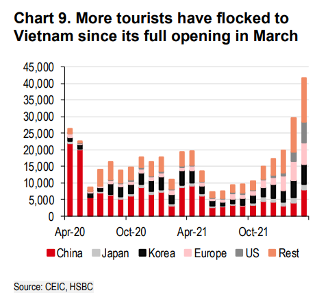 Mặc dù vậy, HSBC cho rằng, vẫn có một tia sáng trong câu chuyện phục hồi trong nước của Việt Nam. Việc mở cửa hoàn toàn là rất quan trọng cho sự phục hồi của ngành dịch vụ bởi phần lớn ngành này phụ thuộc vào du lịch. Sau hai năm đóng cửa, Việt Nam đã mở cửa hoàn toàn cho du khách quốc tế đã tiêm chủng đầy đủ từ 15/3. Chỉ tính riêng trong tháng 3, hơn 40.000 khách du lịch đã đến Việt Nam, tăng gần gấp ba so với mức bình quân tháng của hai năm đại dịch. Số lượng khách đến từ Mỹ và châu Âu tăng mạnh, số còn lại đến từ châu Á.
