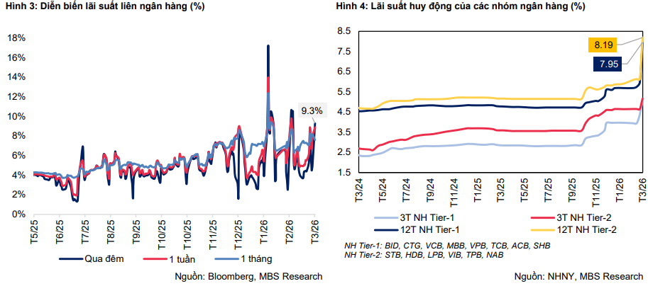 MBS nhận định diễn biến này phản ánh áp lực huy động vốn đang gia tăng, đặc biệt vào thời điểm cuối quý khi các tổ chức tín dụng đẩy mạnh tăng trưởng tín dụng. Theo số liệu từ NHNN, tính đến ngày 23/3, dư nợ tín dụng toàn hệ thống ước tăng khoảng 2,02% so với cuối năm 2025.