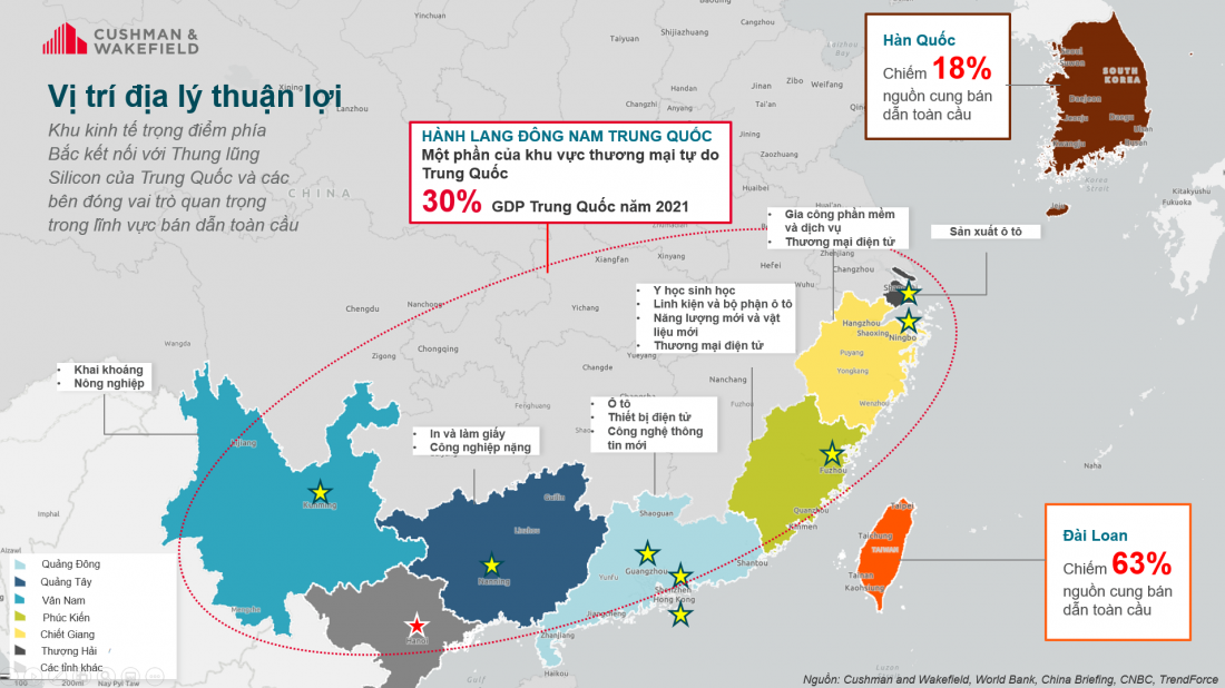Phân tích thêm một lợi thế của miền Bắc, Cushman & Wakefield chỉ ra rằng, nối liền miền Bắc nước ta là hành lang kinh tế phía Nam của Trung Quốc gồm một số vùng nổi bật như Thượng Hải, Hồng Kông, Thẩm Quyến, Phúc Kiến và Quảng Đông. Đây là vùng kinh tế được chọn làm nơi đặt trụ sở của các ông lớn công nghiệp sản xuất, hóa sinh, thương mại và công nghệ điện tử. Theo ước tính của Cushman & Wakefield, vùng này chiếm hơn 30% tổng GDP Trung Quốc năm 2021, đóng vai trò vô cùng quan trọng trong việc thu hút vốn đầu tư và phát triển kinh tế.