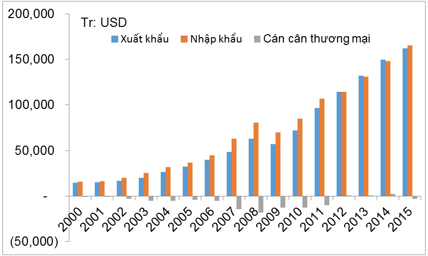 Năm 2015 nhập siêu khoảng 3,2 tỷ đô la Mỹ sau 3 năm xuất siêu liên tục. Nhập siêu của Việt Nam chủ yếu đến từ Trung Quốc và Hàn Quốc.