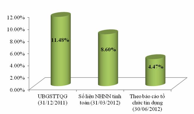 Trước đó, Ủy ban Giám sát Tài chính Quốc Gia (UBGSTCQG) cho rằng nợ xấu sau khi đã điều chỉnh của hệ thống ngân hàng Việt Nam vào thời điểm cuối năm 2011 lên tới 11,48%, tương đương mức 320,82 nghìn tỷ đồng, gấp 4,16 lần nợ xấu báo cáo vào thời điểm đó. Nợ xấu bất động sản theo báo cáo này cũng lên tới 16,31%, tương ứng 56,77 nghìn tỷ đồng.