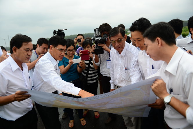 Phó chủ tịch UBND tỉnh Đồng Nai Trần Văn Vĩnh (thứ hai từ trái qua) giới thiệu vị trí dự kiến xây dựng khu tái định cư khi xây dựng sân bay quốc tế Long Thành chiều 16-10 - Ảnh: Quang Định