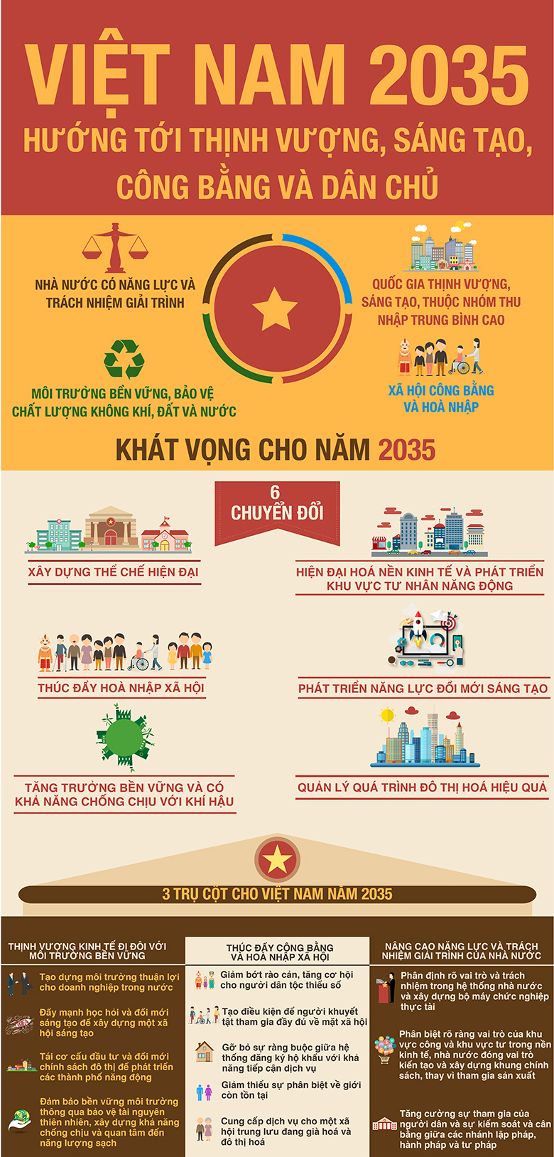 Theo đó, Việt Nam đặt mục tiêu đến năm 2035 đạt thu nhập bình quân đầu người hơn 7.000 USD (theo giá thực tế), tương đương 18.000 USD tính theo sức mua tương đương 2011. Tuy nhiên, với GDP bình quân đầu người 2015 mới ở mức 2.109 USD, mục tiêu này được đánh giá khá thách thức khi đòi hỏi tốc độ tăng trưởng 7% mỗi năm, cao hơn hẳn mức tăng trưởng trung bình giai đoạn trước.