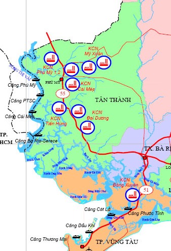 Các khu công nghiệp xây dựng mới, có diện tích khoảng 1.845 ha, bao gồm các khu: Phú Mỹ II mở rộng diện tích 403 ha (thép, hóa chất,...), Phú Mỹ III diện tích 942 ha (điện, thép, phân bón, hóa chất, công nghiệp nặng,...), Long Hương diện tích 400 ha, Mỹ Xuân mở rộng diện tích 100 ha.