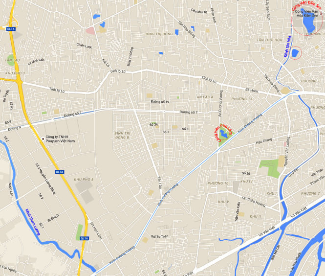 Kênh Kinh Dương Vương (tạm gọi là vậy) trên đường Kinh Dương Vương thông thủy với kênh Tham Lương và kênh Tân Hóa - Lò Gốm cũng như các hồ tự nhiên xung quanh - Đồ họa: T.THIÊN