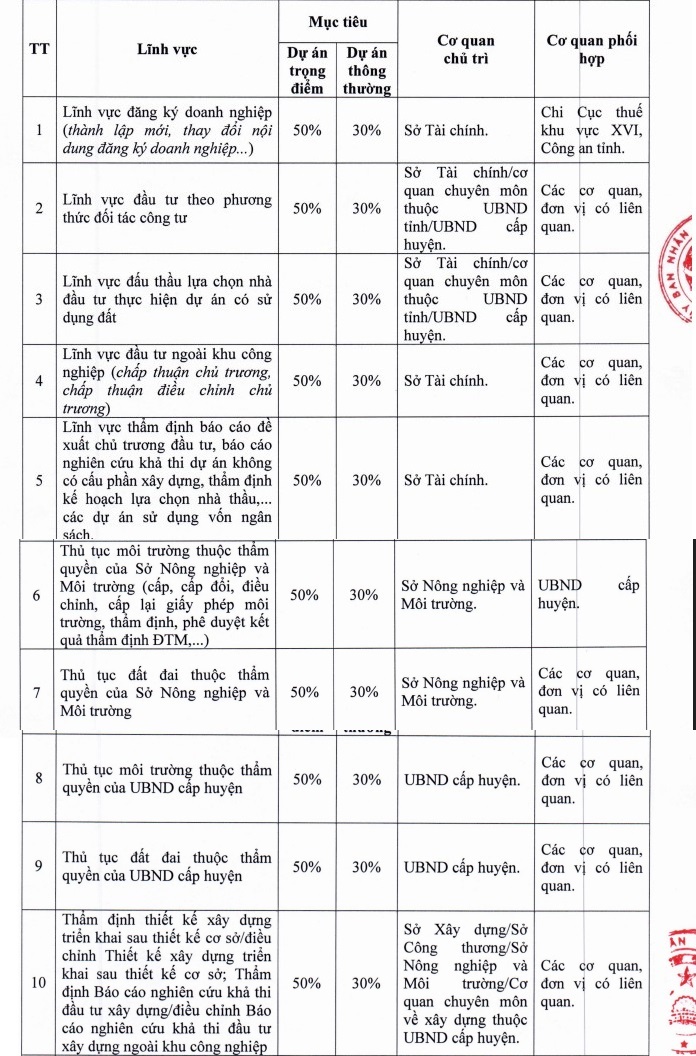 Lĩnh vực đầu tư ngoài khu công nghiệp (chấp thuận chủ trương, chấp thuận điều chỉnh chủ trương): đối với các dự án trọng điểm mục tiêu rút ngắn đến 50%, đối với các dự án thông thường là 30%.