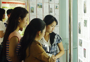Người dân đang tìm mua căn hộ tại phòng giao dịch nhà đất. Ảnh: HTD